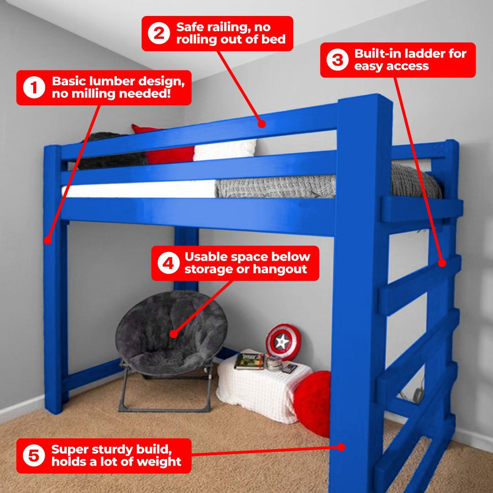 The DIY Loft Bed is a great addition to any kid or college student’s room. It’s sized for a twin mattress and stands 68 1/2” tall with plenty of room for a reading, playing or studying nook below.