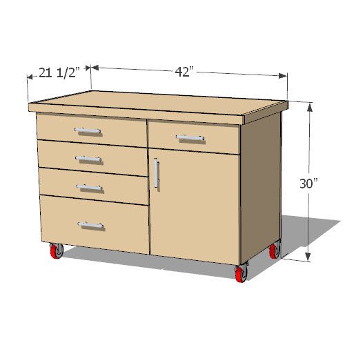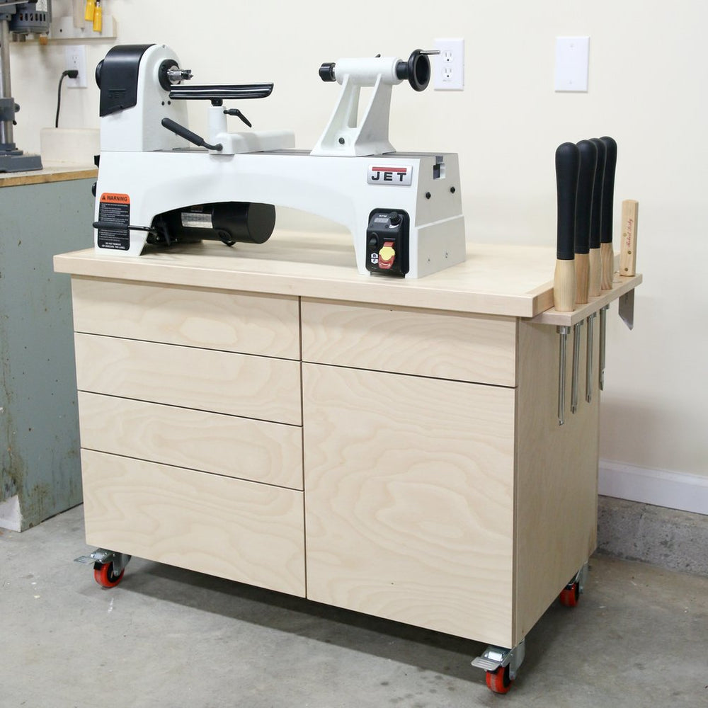 Make a dedicated workstation for your lathe and enjoy your woodturning more! This wood lathe stand has 5 drawers and a cabinet door to hold all your lathe hardware, tools and blanks. It is 42” wide, 30" tall and 21-1/2” deep to give extra space for dust collection and a landing zone for turning accessories. Made out of 2 sheets of ¾” plywood and some maple trim, this mobile stand is a great build for your dream shop!