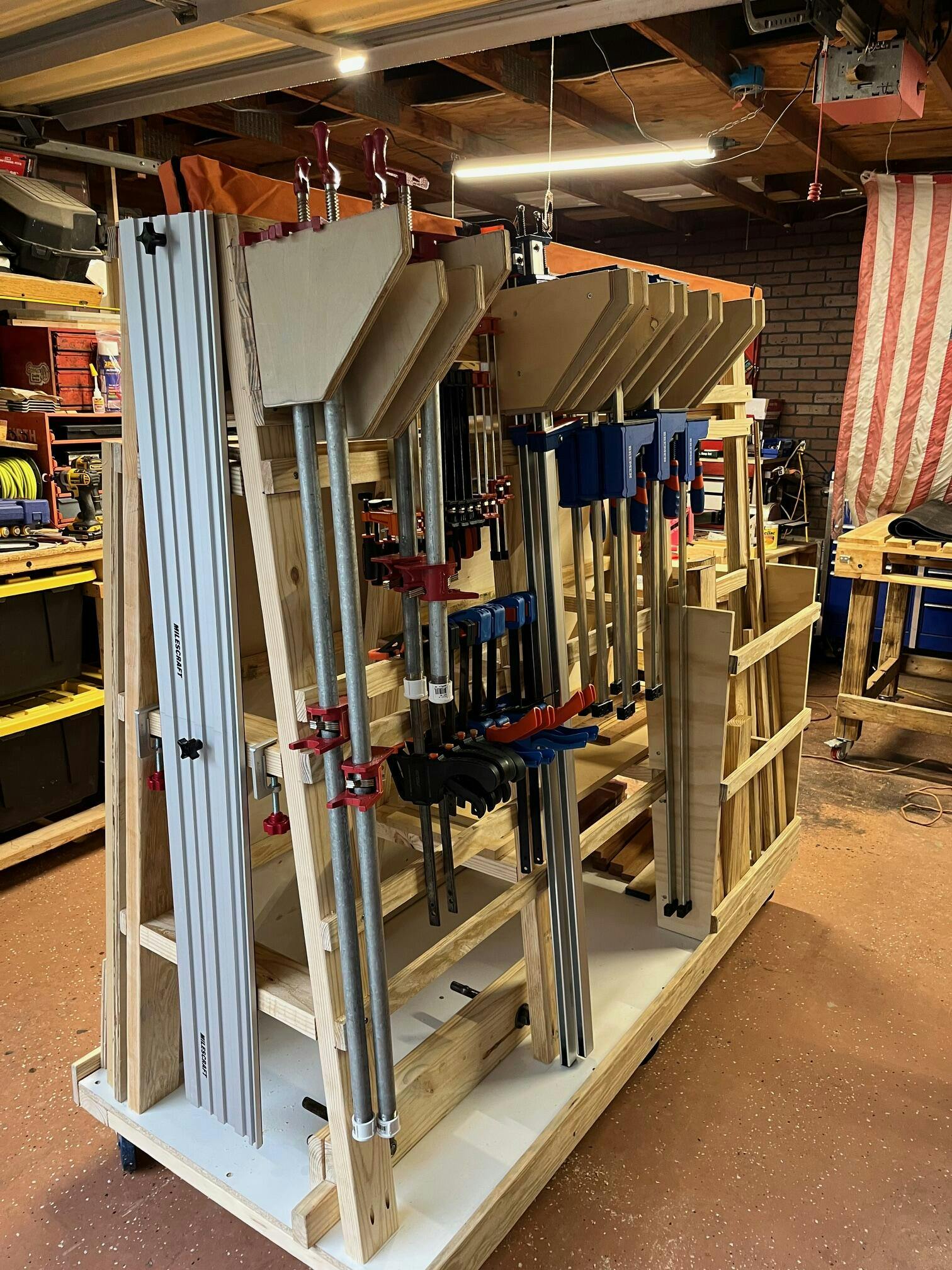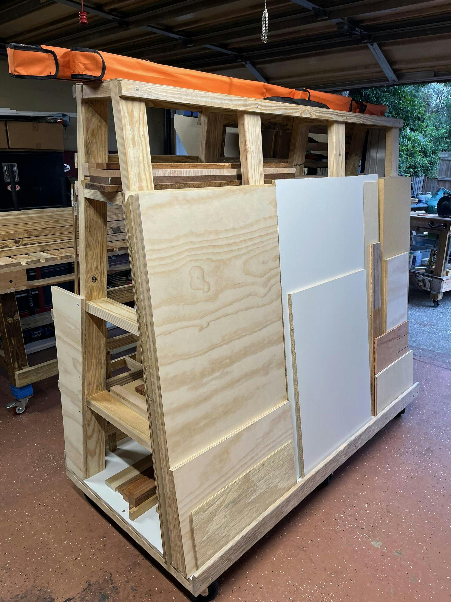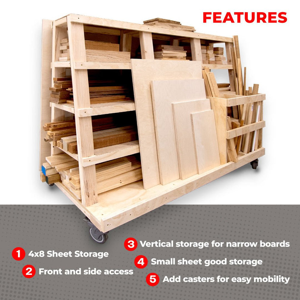 Tired of plywood, offcuts, and random wood all over your shop? Build this Mobile Wood Storage Cart and get a place for all your lumber! It's 6' long and 28" wide with storage on both sides and four interior shelves (plus an open top shelf). Add vertical wood storage on a small section or an entire side to fit your needs.