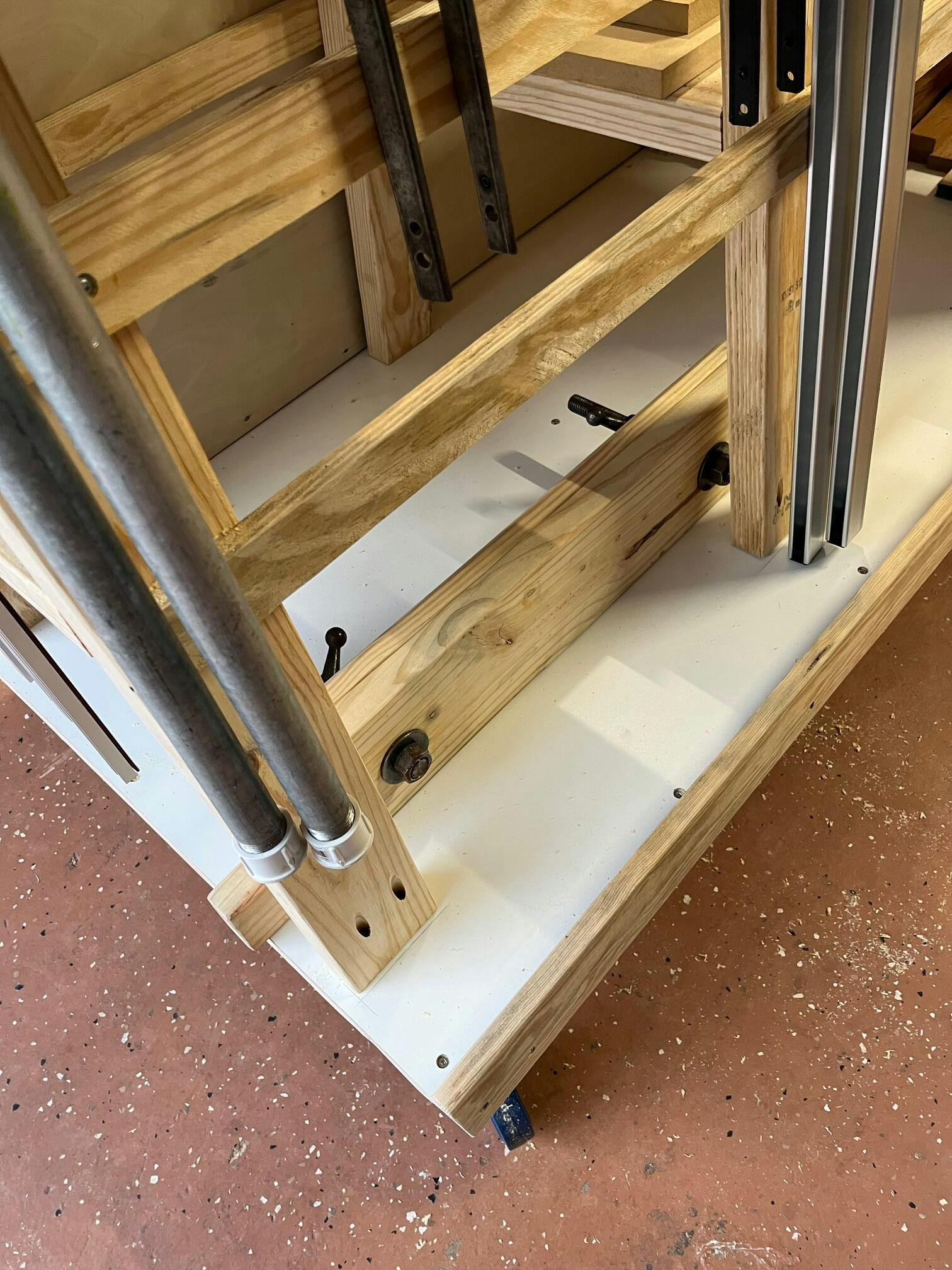 It's made from one sheet of 3/4" plywood and 8 2x4's and can be made with just a circular saw, miter saw, a pocket hole jig and set of drills. Add an optional sheet of ply to cover the interior and hold small parts on this wood rack.