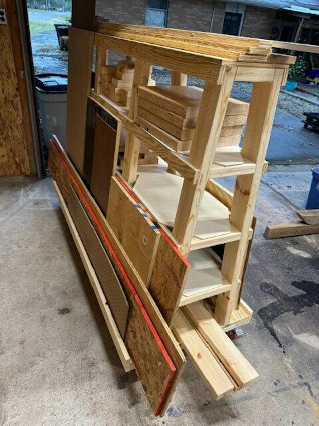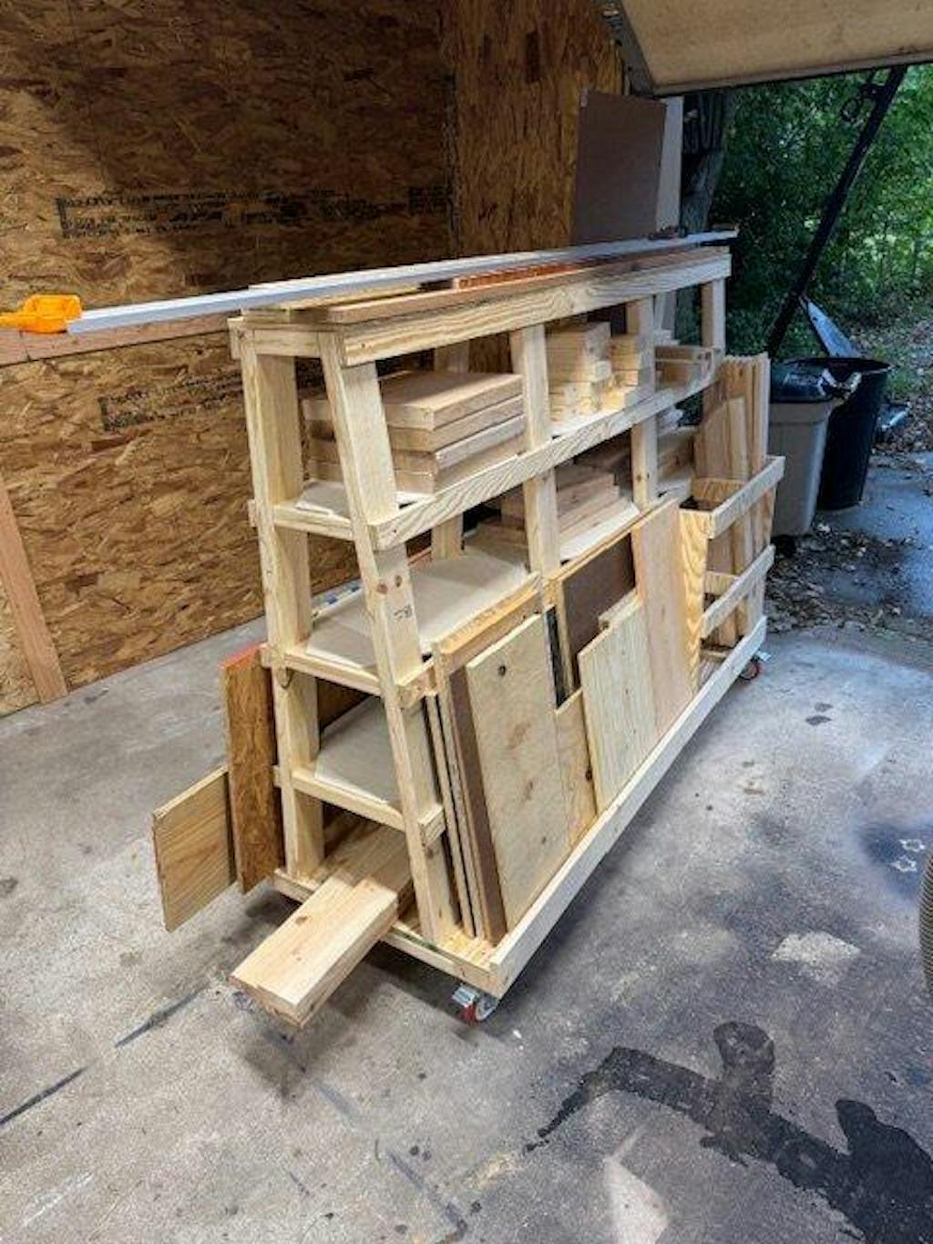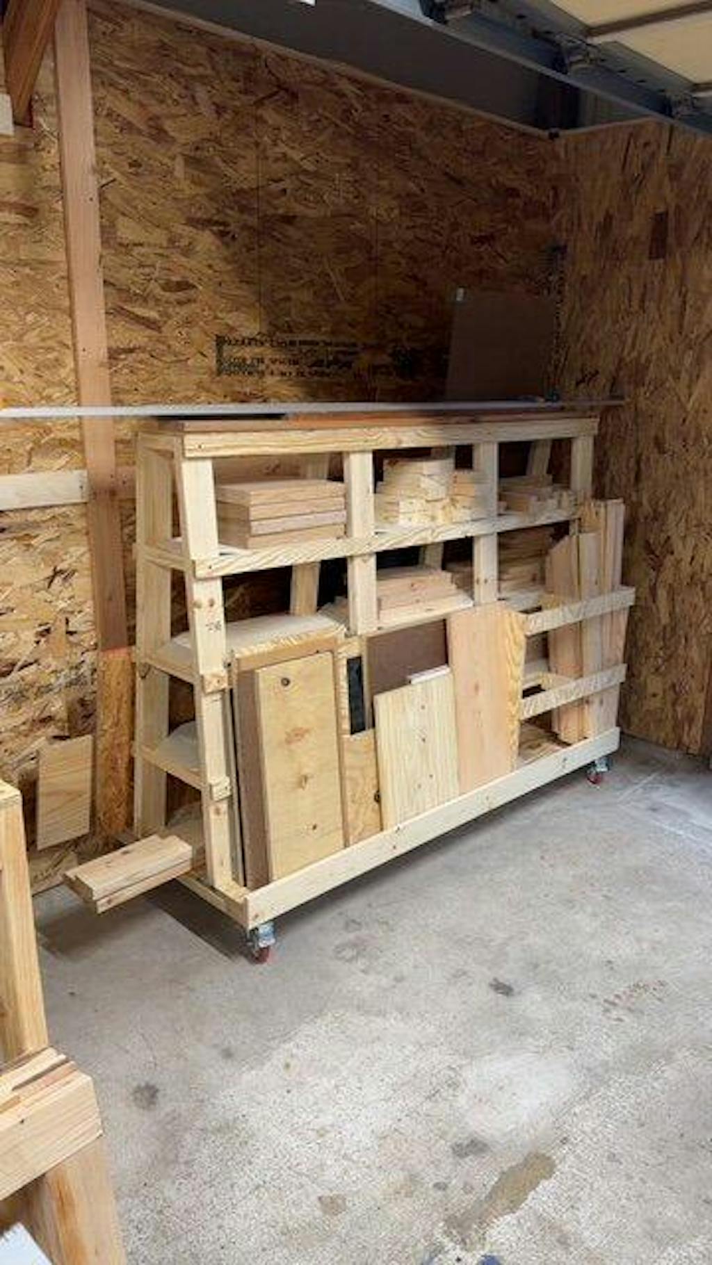 Tired of plywood, offcuts, and random wood all over your shop? Build this Mobile Wood Storage Cart and get a place for all your lumber! It's 6' long and 28" wide with storage on both sides and four interior shelves (plus an open top shelf). Add vertical wood storage on a small section or an entire side to fit your needs.