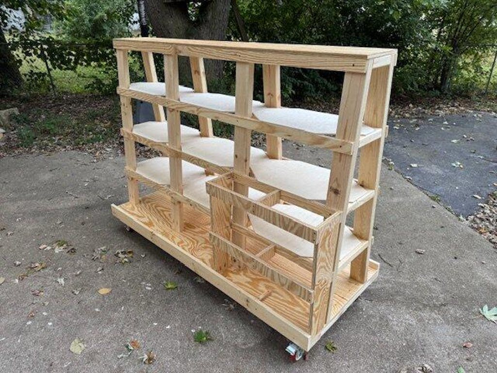 It's made from one sheet of 3/4" plywood and 8 2x4's and can be made with just a circular saw, miter saw, a pocket hole jig and set of drills. Add an optional sheet of ply to cover the interior and hold small parts on this wood rack.