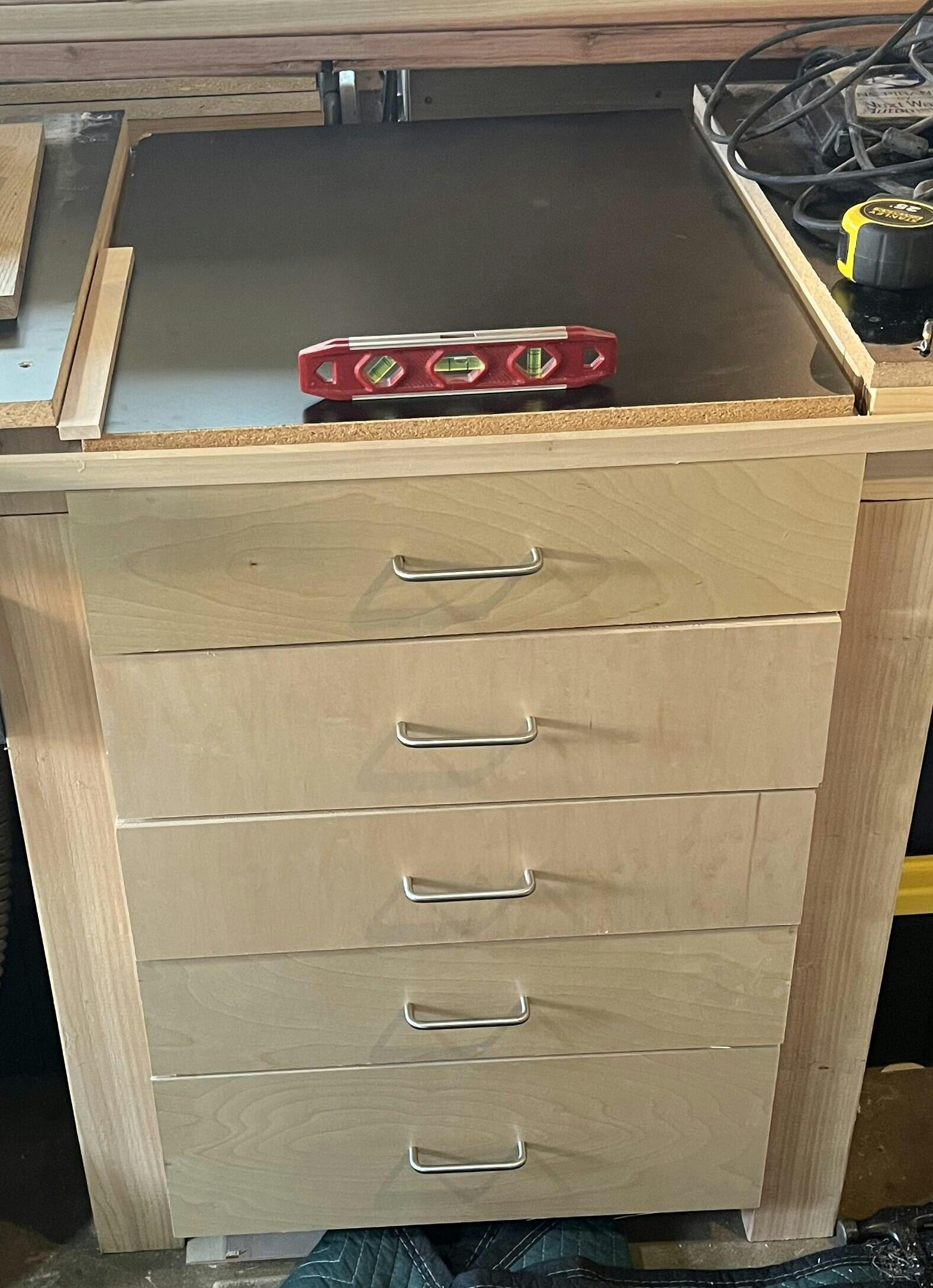 This Drill Press Stand is the perfect addition to organize all your drill press accessories and adds mobility to an essential shop tool. Five drawers create a ton of storage options. The cabinet is 16-1/2” wide, 25” deep and stands 34-1/2” tall with casters installed and can be made from just 1 sheet of 3/4" plywood, a little over a half sheet of 1/4" plywood, and some solid wood trim.