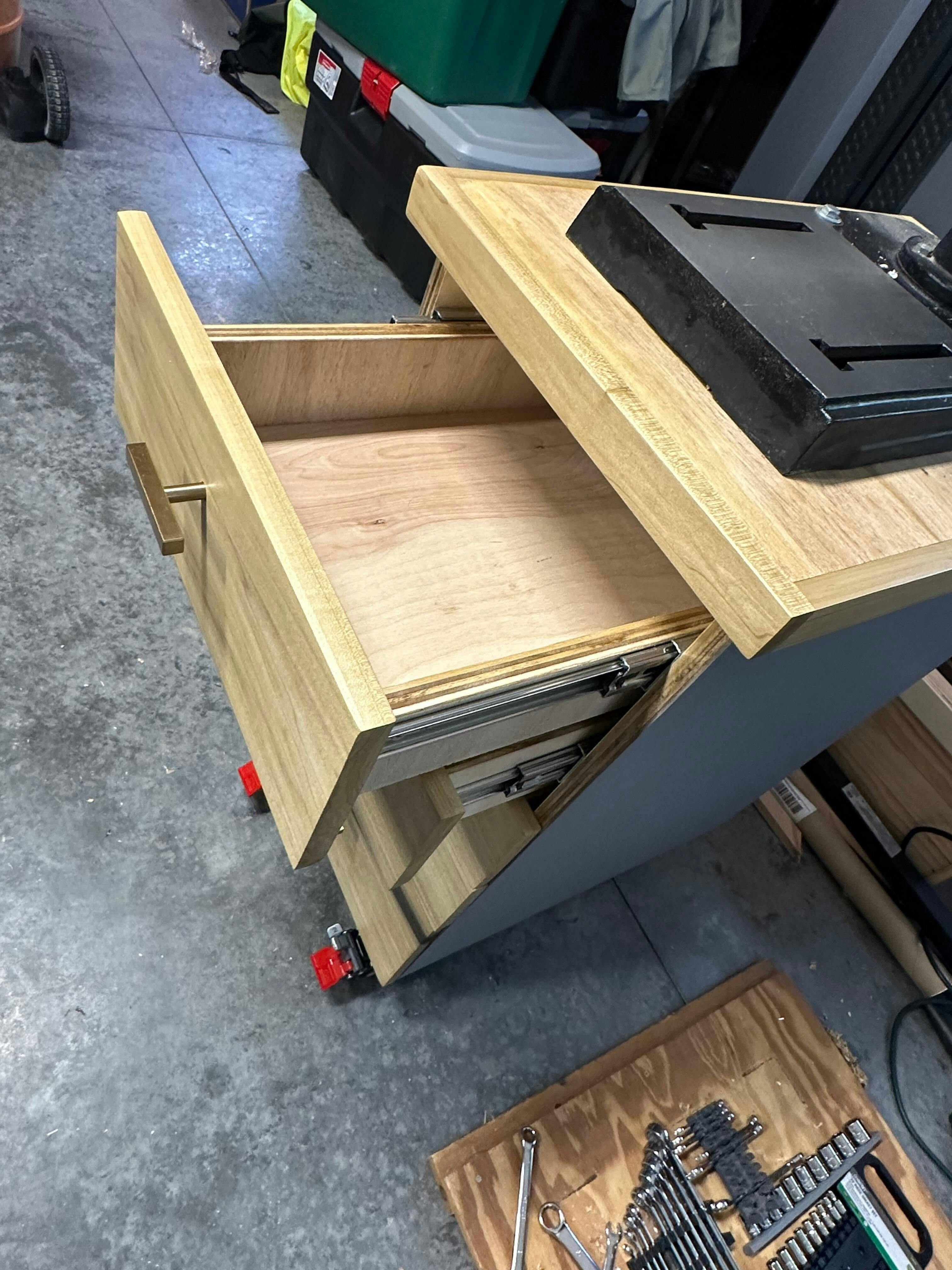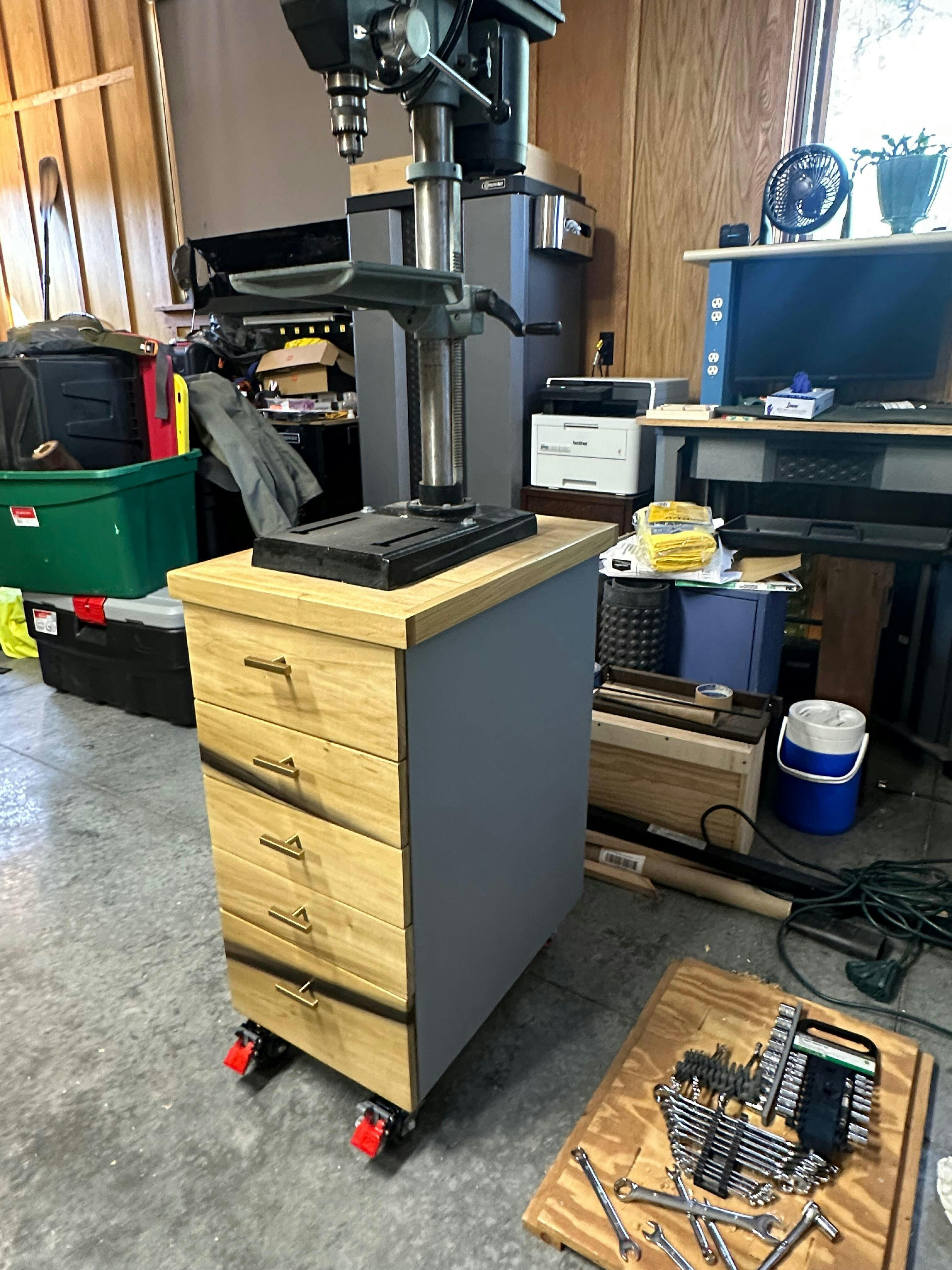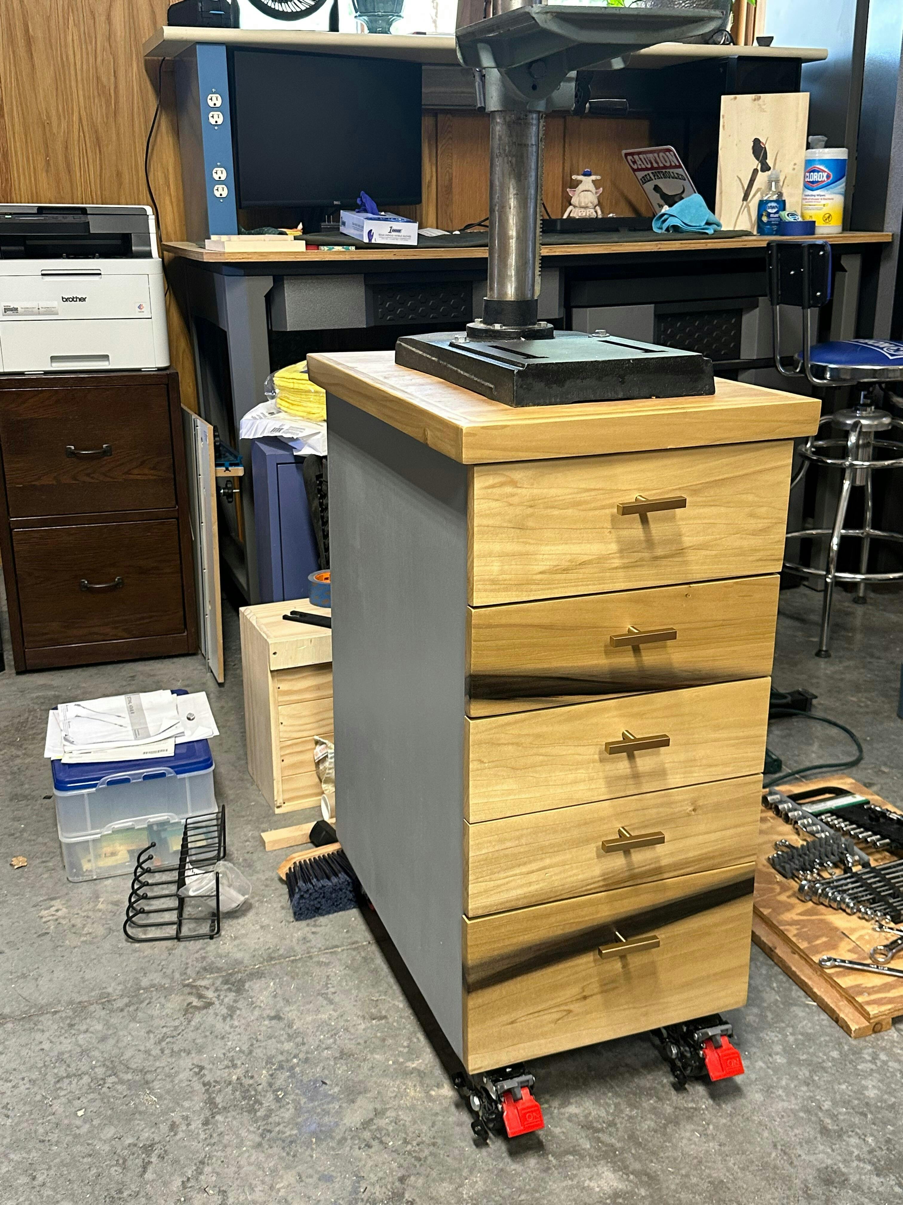 This Drill Press Stand is the perfect addition to organize all your drill press accessories and adds mobility to an essential shop tool. Five drawers create a ton of storage options. The cabinet is 16-1/2” wide, 25” deep and stands 34-1/2” tall with casters installed and can be made from just 1 sheet of 3/4" plywood, a little over a half sheet of 1/4" plywood, and some solid wood trim.