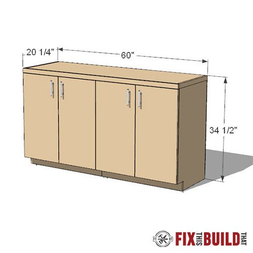 The two cabinets can be made from two sheets of ΒΎβ plywood and one sheet of ΒΌβ plywood. Add another ΒΎβ sheet for the top or use a solid wood or store bought counter top. Either way it will be a great addition to your garage shop!