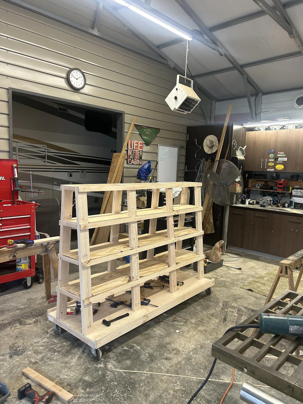 It's made from one sheet of 3/4" plywood and 8 2x4's and can be made with just a circular saw, miter saw, a pocket hole jig and set of drills. Add an optional sheet of ply to cover the interior and hold small parts on this wood rack.
